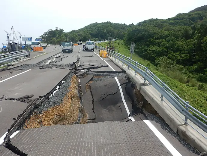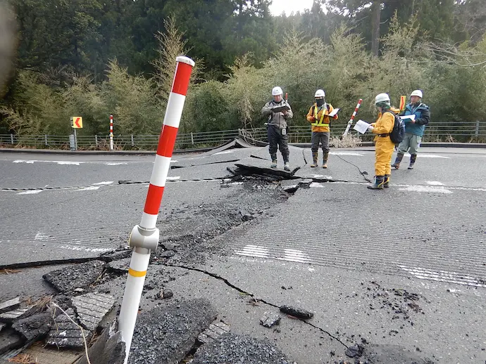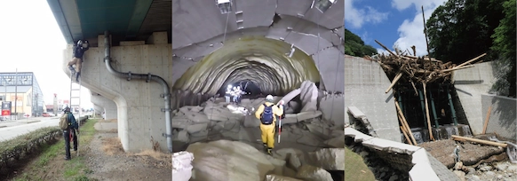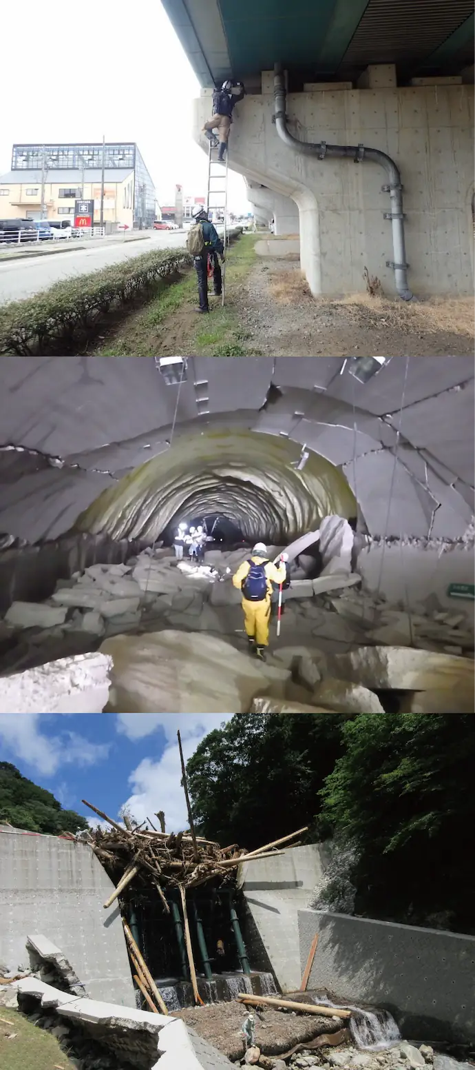 災害発生現場の地盤や土壌の状態・斜面の変動などを調査し、地滑りや陥没など二次災害のリスク評価、構造物の被災メカニズムの解明を行い、防災対策に繋げると共に、その後の復旧・修復工事のための基礎データの収集を行います。