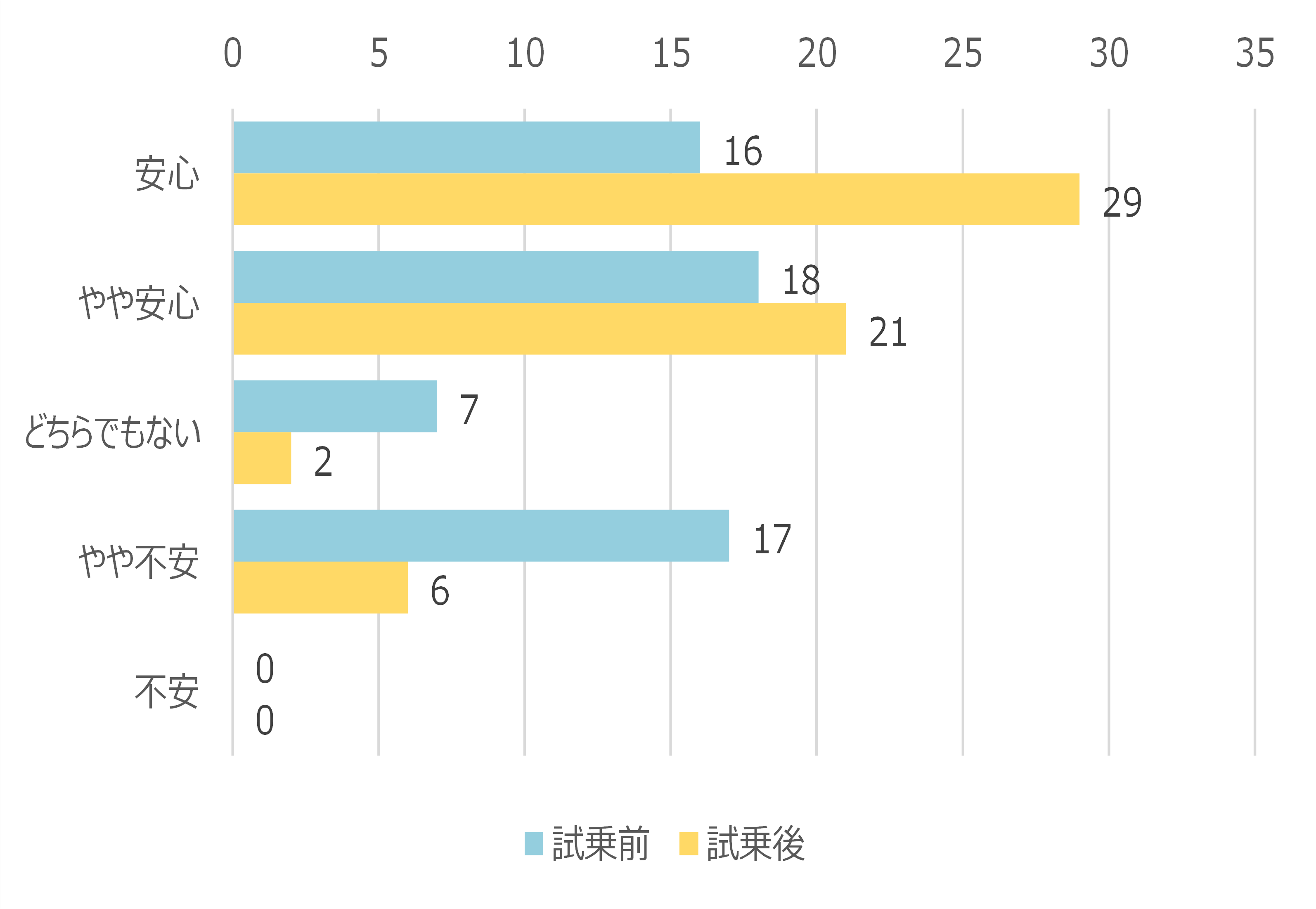 試乗者へのアンケート結果から、試乗前には不安に感じていた人が多くみられましたが、実際に試乗体験した後には安心だと感じる人が多くなり、安心感の変化が確認できました。