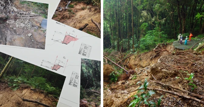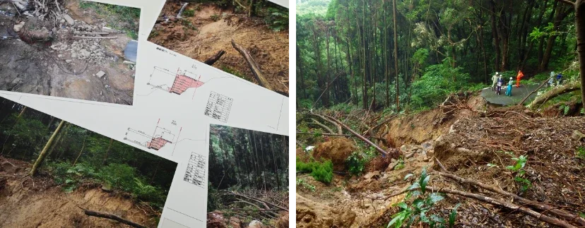 この段階で調べるのは、被災の規模と範囲、そして必要となる測量や調査についてだ。これらの情報をまとめて1~2日で大牟田市に提出。併せてその後の工程について提案し、それが通れば復旧事業が本格的にスタートする。