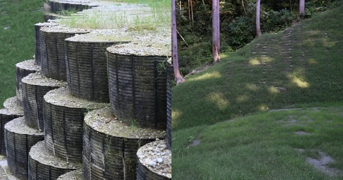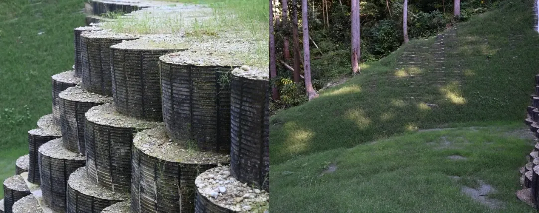 そこで、大型の機材が不要で擁壁を直壁構造にできる3つの工法をピックアップし、その中で比較検討を行った結果、アンカー補強土壁(多数アンカー工法)を採用することになった。これは壁面と平行になるように多数のアンカープレートを設置する工法で、それによって盛土が補強される。また、安全かつ精度の高い施工が可能で、盛土には現地で発生した土を利用でき、経済性も良い。