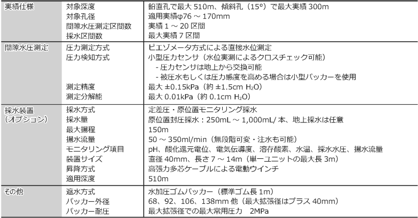 PIEZOとはダイヤ式多深度間隙水圧測定システムの呼称で、単一のボーリング孔で多深度の間隙水圧を測定できる装置です。また、専用の採水装置を用いることで、多深度で地下水採取、原位置での水質測定が可能です(特許取得済)。